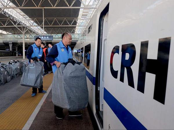 从11月11日起,为满足电商企业更加高效、快捷的快件运输需求,成都铁路局合理开发运用动车组富余运能,在成都、重庆、贵阳三个地区安排整车高铁快运动车组31趟,北京、上海、武汉、南京、杭州等方向的快件实现“当日达”的实效要求;在贵阳北站推出2对动车组确认列车载货快运产品,贵阳前往昆明、长沙方向的快件有望3小时送到客户手中;除了高铁快运,此次电商黄金周期间,成都铁路局还将加大普速列车行李车运输能力,依托普速列车为广大货主办理快运包裹。
