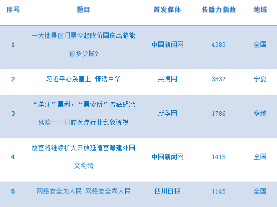 新华网炫知传播力分析系统显示,今日互联网传播力前五名分别是: