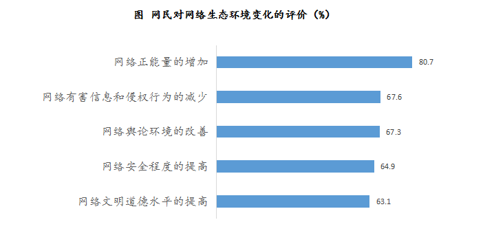 经过2015年一系列网络治理行动,网络环境得到了明显改善,清朗程度进一步提高。调查显示,广大网民对2015年网络生态环境进一步向好发展表示高度认可,其中,80.7%的网民表示网络正能量增加了。