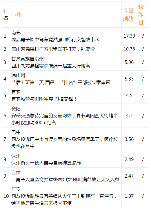 ※本文列举了今日指数最高的10个地区,同时列举了今日指数较昨日的涨跌值,以及时段内的主要敏感新闻或信息。